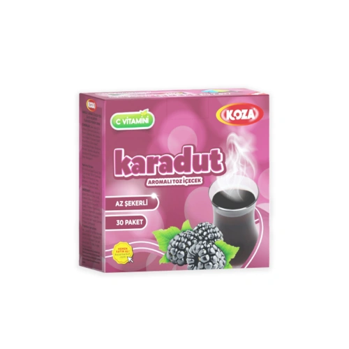 Koza tek içimlik AZ ŞEKERLİ Karadut aromalı toz içeceği, el değmeden hatta neredeyse hava bile değmeden, tam otomatik makinelerde, tertemiz bir ortamda üretildi.