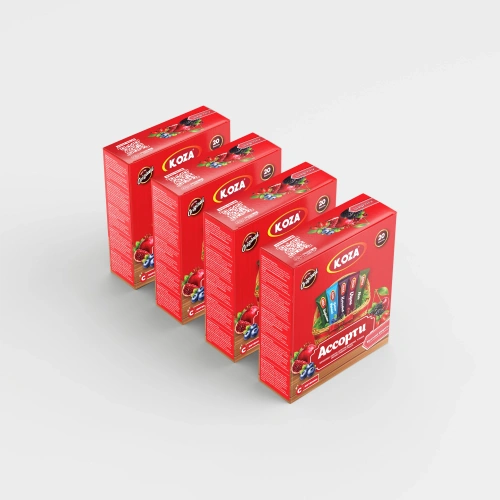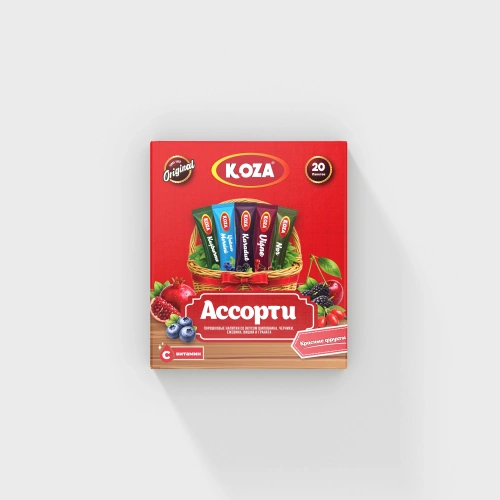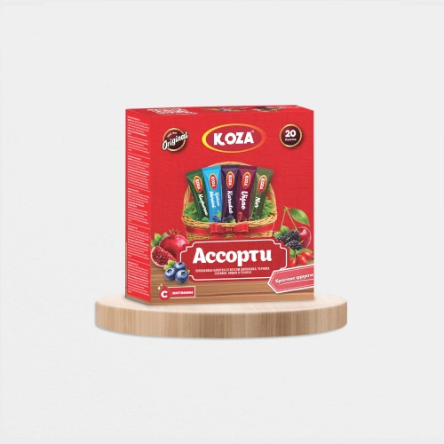 Asorti Kırmızı, farklı lezzetleri tek bir pakette deneyimlemek isteyenler için özel olarak hazırlanmıştır. Paket içerisinde karadut, vişne, kuşburnu, yaban mersini, nar aromalı tek içimlik içecek tozları bulunmaktadır. Her bir aromadan 4 adet olacak şekilde paketlenen bu set sayesinde tek bir ürünle Koza’nın sevilen 5 farklı lezzetini kolayca deneyebilirsiniz.