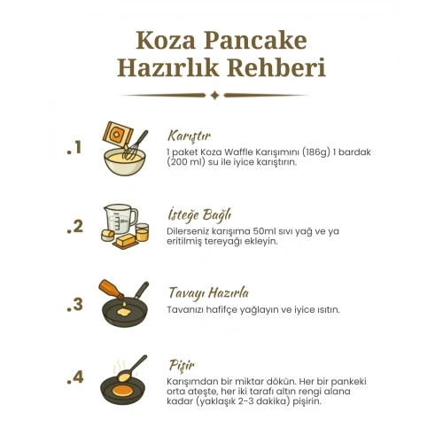 Hazırlanışı: 1 paket Koza Pancake Karışımını (186g) 1 su bardağı (200 ml) su ile karıştırın. Tamamen çözülene kadar iyice karıştırın. Karışımı tavaya dökün ve pancakeleri her iki tarafını da yaklaşık birer dakika pişirerek altın rengini alana kadar pişirin. *İsteğe bağlı: Karışıma yarım çay bardağı (50 ml) yağ ekleyebilirsiniz.